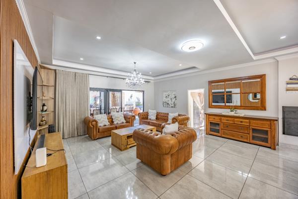 The kitchen is a true standout, featuring sliding windows, a centre island, and a separate scullery and laundry. The open-plan dining and TV area provide a seamless flow through the heart of the home. A spacious playroom leads off the TV room, perfect for children or additional living space.