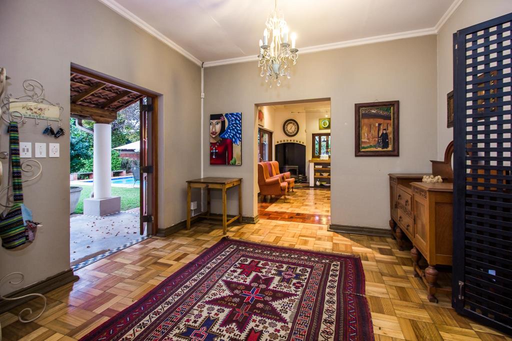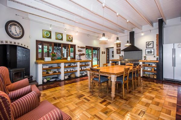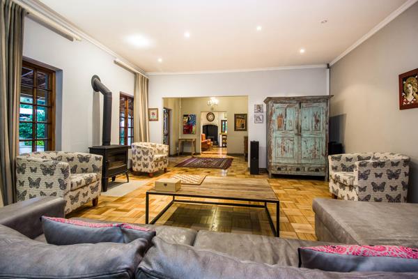 Outdoors, enjoy a lush park-like garden, sparkling swimming pool, and three covered carports. Additional features include a backup power system, borehole, domestic quarters, and excellent security.