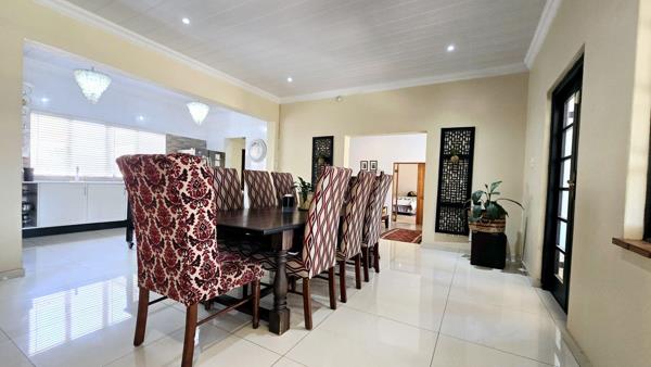 The dining room opens onto a large covered patio overlooking the garden and sparkling swimming pool the perfect space for gatherings and outdoor entertaining.
