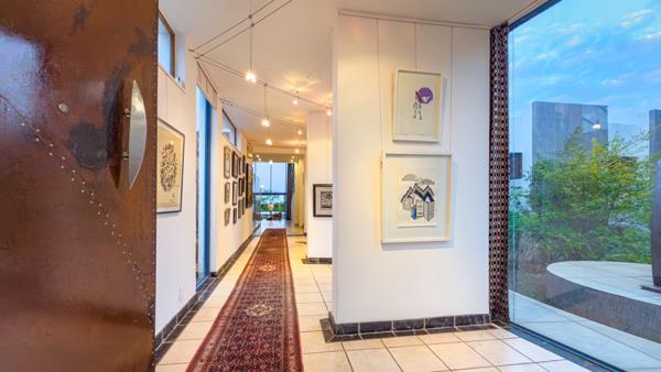 Sophisticated finishes include motorized curtain tracks imported from The Netherlands and a motorized retractable awning. The homes striking entrance hall doubles as an art gallery, with captivating works by renowned steel artist Marc Swart enhancing both the interiors and garden.