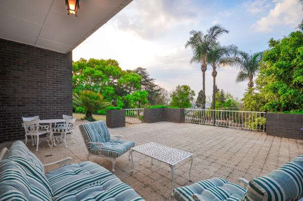 Enjoy serene outdoor living on the patio overlooking the landscaped garden and city skyline. Additional features include a large cellar/storage area, double garage, and a beautifully maintained garden.