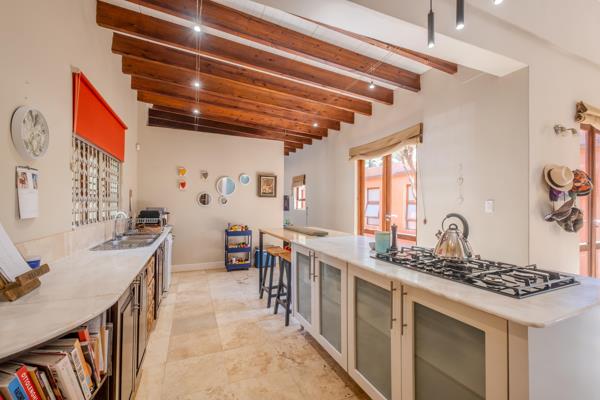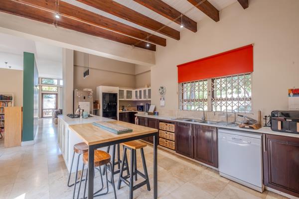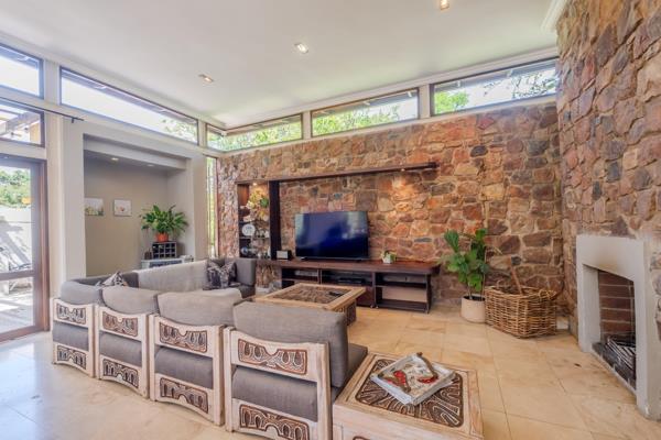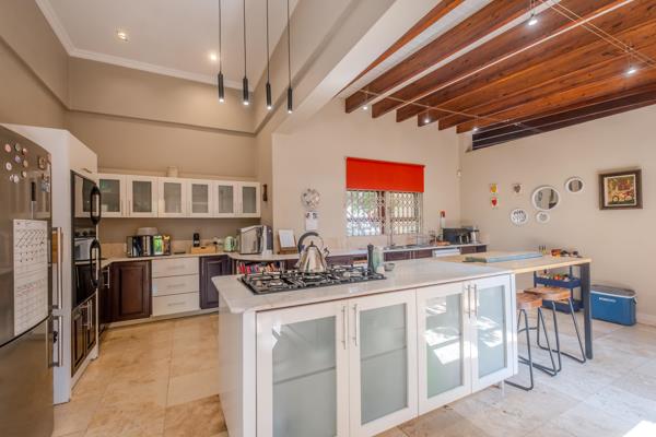 This magnificent large family home is situated in the heart of Waterkloof. Entering the glass and wooden front door you are welcomed in to a large open plan living area with floor-to-ceiling glass windows and a large fire place for cosy winters. This room is ideal for entertaining as it flows out to a large patio with a sparkling pool and a kids play area.