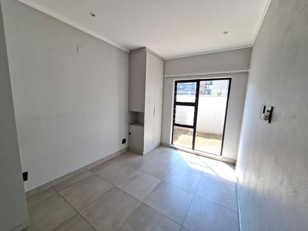 The living area extends through sliding glass doors to a private garden which offers a built-in countertop with a small prep area,and gas braai.
