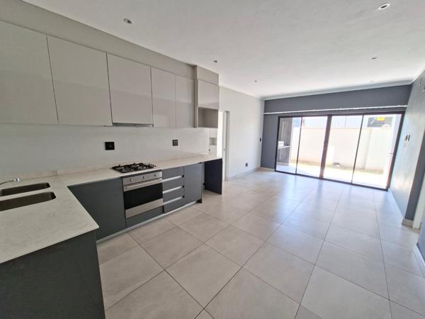 This modern two-bedroom, two-bathroom apartment is designed for a convenient and comfortable lifestyle. The open-plan living area features flooring and a neutral color palette with an accent wall, creating a spacious and inviting atmosphere. The kitchen seamlessly integrates with the living space, boasting glossy grey cabinetry, a gas stovetop (smeg) with an extractor fan, and a light-colored countertop.
