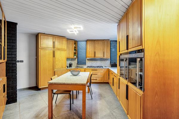 The modern kitchen boasts a gas stove, pantry, scullery, and a convenient serving hatch to the outdoor entertainment area.