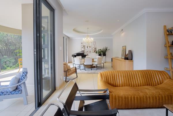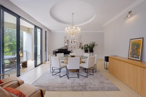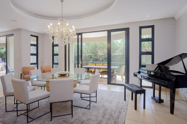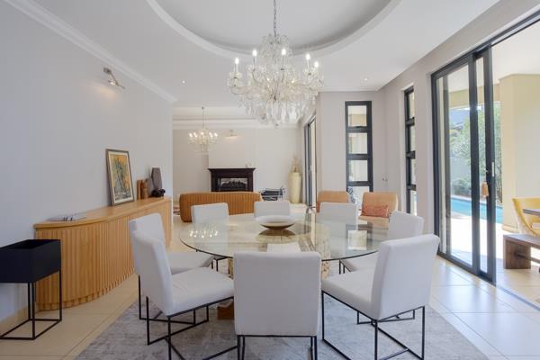 The elegant dining room and formal lounge, with carefully designed downlighters and stunning chandeliers, open out onto the generous curved covered patio that overlooks a splendid lap pool.
