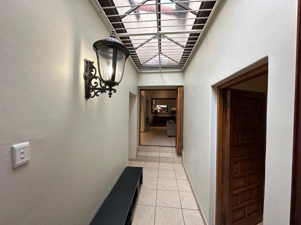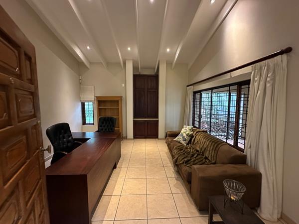 The home welcomes you with a charming front porch that leads into a bright reception area, enhanced by a skylight that fills the space with natural light and provides a serene atmosphere for the private home office. The elegant lounge, featuring high exposed beams, flows seamlessly into the spacious dining room and onto a large covered patio. This entertainment area overlooks the swimming pool and braai space, creating an inviting setting for gatherings and relaxed family time.