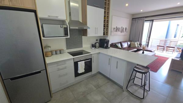 Enjoy the South African climate from your private balcony, accessible via large sliding doors from the living area. This outdoor space, complete with seating and green views, is perfect for relaxation or a morning coffee. A built-in braai enhances the outdoor living experience, making it ideal for entertaining.