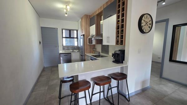 Step inside to an inviting open-plan living and kitchen area, designed for seamless entertaining and daily life. The space is accentuated by a striking exposed brick wall, complementing the modern aesthetic. The compact yet highly functional kitchen boasts sleek two-tone cabinetry, quartz countertops, stainless steel appliances including an oven, hob, and dishwasher, plus an integrated wine rack. A breakfast bar provides casual dining or additional prep space, while tiled flooring extends throughout for easy maintenance.