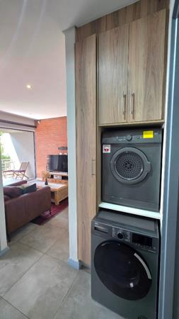 Residents benefit from enhanced security features including an access gate, security gate, electric fencing, and intercom system within the complex. Practical amenities include an integrated laundry station with stacked washer and dryer, and two dedicated parking spaces, adding to the convenience of this Waterkloof apartment.