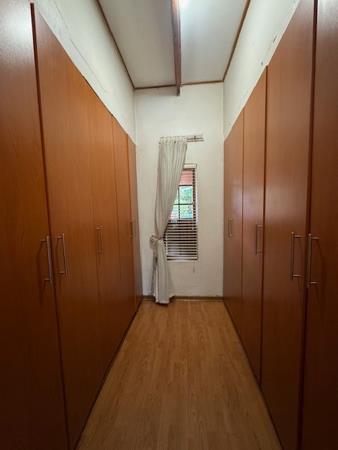 Outdoor living is a highlight, with a large garden providing a tranquil retreat. The property features a swimming pool and a thatched lapa, ideal for outdoor entertaining and enjoying the South African climate. Practical amenities include a four-car garage and additional parking for six vehicles, ensuring ample space for residents and guests. Further enhancing convenience are staff quarters, a laundry room, and dedicated storage.