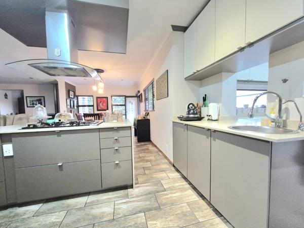 The modern open plan kitchen with cooking island with gas hob and electric oven, ample cupboard space and separate scullery laundry is any chefs dream!!! The quarts tops and light finished of the cupboards contributes to an elegant look.