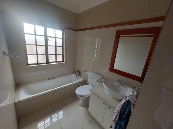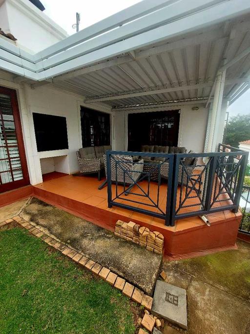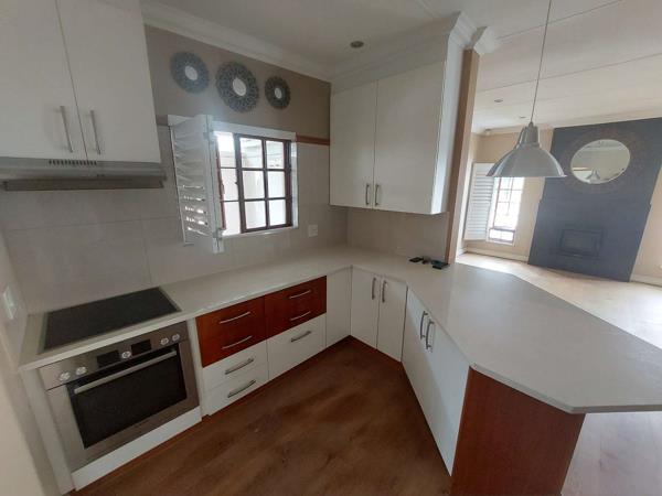 The open living areas link with a well-equipped and custom designed kitchen that boasts a separate scullery, ample cupboard space and provision for all your appliances. The lay-out lends itself to cozy living as well as entertaining guests on an inviting louvred patio, equipped with a built-in braai.
