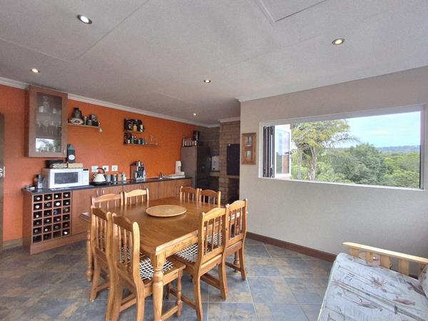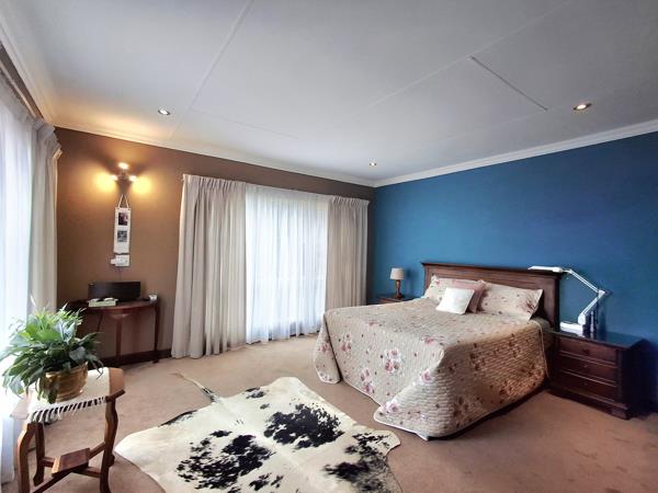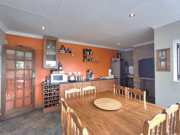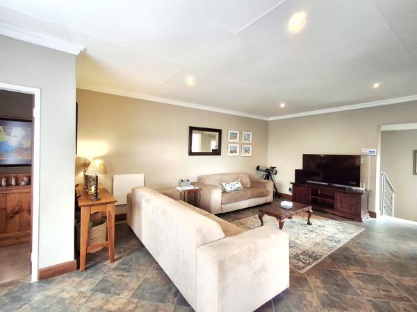 Upstairs is a large family room leading to a fully equipped braaientertainment room with stacking windows opening onto a wonderful view. The entertainment room includes built-in cupboards and a built-in braai, basin and space for a fridge. The upstairs main en-suite bedroom has all the luxuries consisting of a walk-in closet and a full bathroom. The 2nd upstairs bedroom has its own shower and basin and a study area. A separate guest toilet is convenient for visitors.