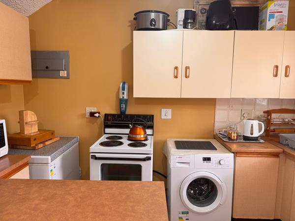 Downstairs, the home features an open-plan kitchen with melamine cupboards, practical work surfaces and a breakfast nook, with space for your appliances.