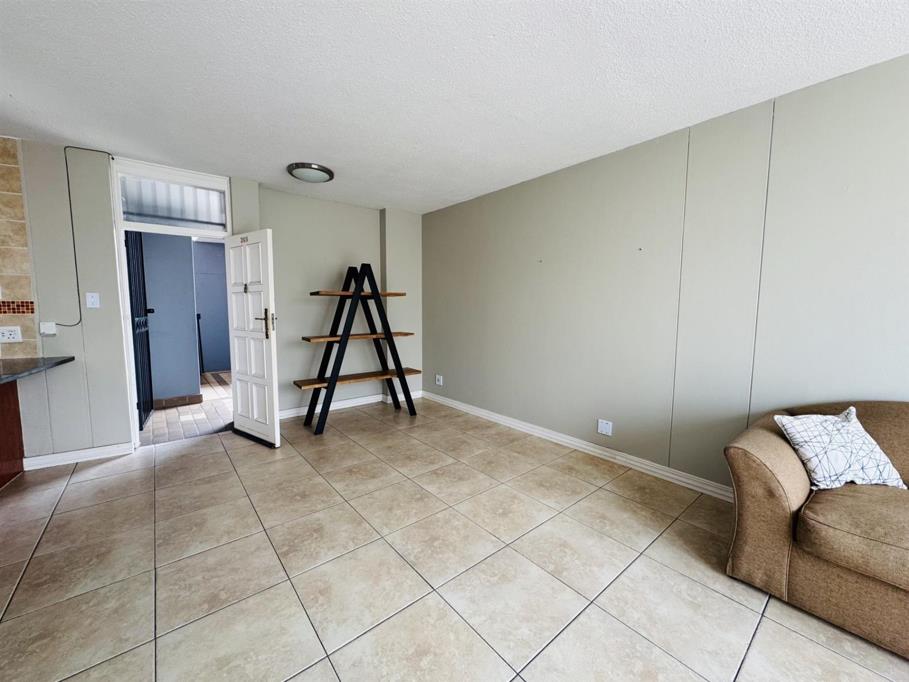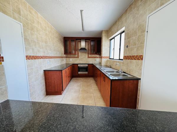 The open-plan kitchen features granite countertops, ample cupboards, an oven, and extractor fan, plus a small laundry nook to discreetly house your washing machine. Aluminium windows, sliding doors, tiled floors, and built-in cupboards create a sleek, modern interior.