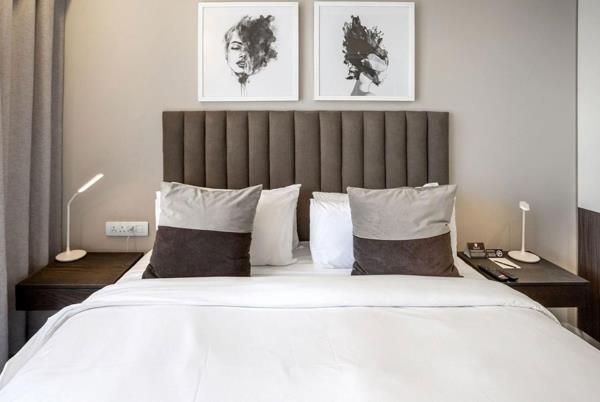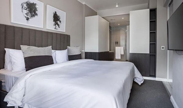 The modern en-suite bathroom flows seamlessly from the bedroom, while floor-to-ceiling windows flood the space with natural light and spectacular city views.