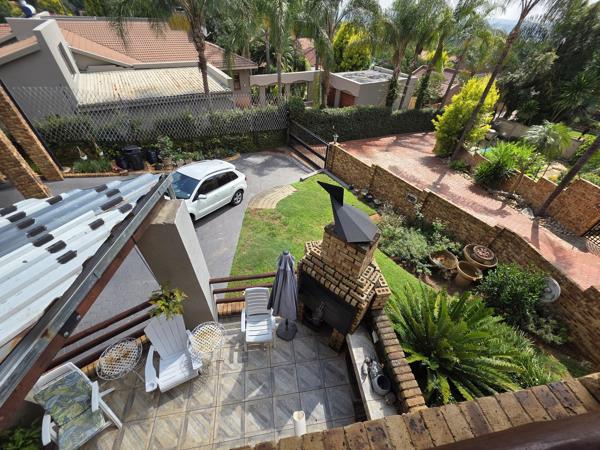 The ground floor also features a covered patio, braai area, study, and a bar for entertaining.