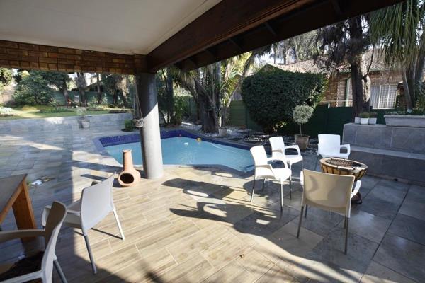 Enjoy year-round entertaining on the covered patio with a built-in braai, overlooking a sparkling swimming pool and a wraparound garden with an automatic irrigation system. The lush garden includes lemon, avocado, tangerine, granadilla, and pawpaw trees.