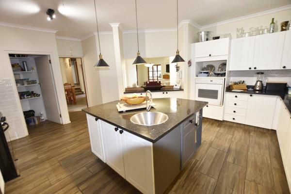 The modern kitchen boasts stylish granite countertops, a central island, gas hob with electric oven, walk-in pantry, wine cabinet, and a separate scullery with space for all your appliances.