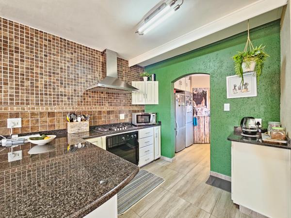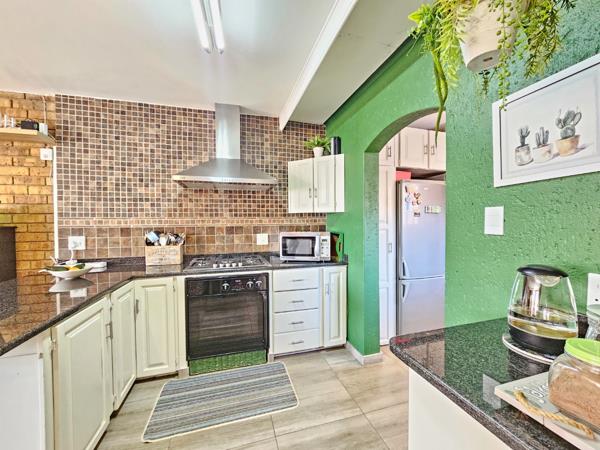The heart of the home features an inviting open-plan layout with a spacious TV lounge, an elegant dining area, and a modern kitchen fitted with granite countertops, a gas hob, electric oven, and a separate scullery and pantry for added convenience. The home also includes a guest toilet on the ground floor and a versatile fourth bedroom, perfectly suited to be used as a private study or home office.