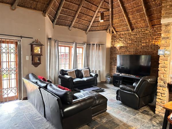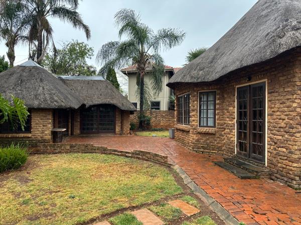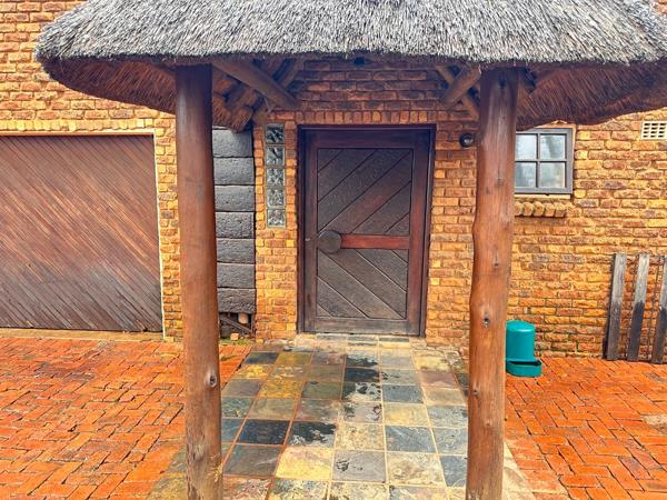 This charming thatch roof house is nestled in a serene neighbourhood of Moreleta Park, offering a comfortable open plan lifestyle designed for family relaxation and entertainment. The stunning open-plan living space boasts elegant interior finishes, beautifully complemented by rich sleeper wood accents.