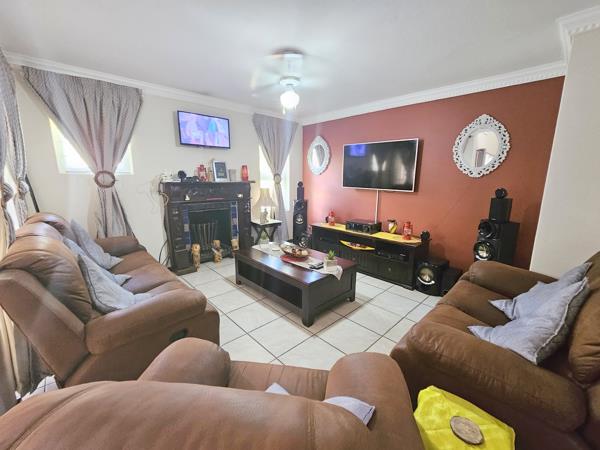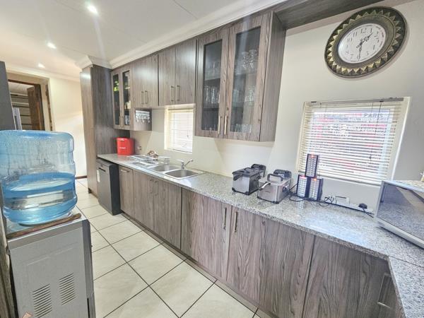 The double garage is generously sized to fit a double cab bakkie with ease. It has been stylishly finished with tiles, cornices, and a ceiling, previously used as an office space.