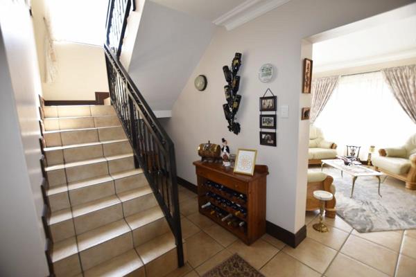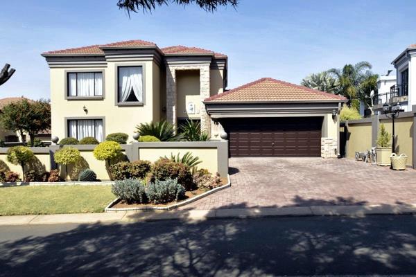 An enclosed patio with a built-in braai opens seamlessly onto the landscaped garden, creating the ideal indoor-outdoor flow for year-round entertaining. The property also includes a staff cloakroom with toilet and washbasin, plus a double automated garage and extra parking.