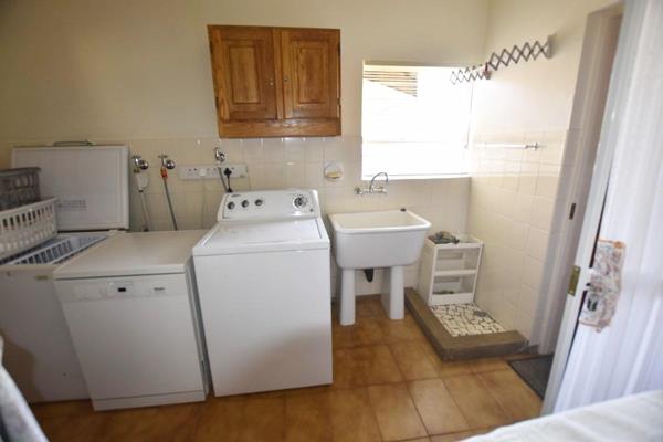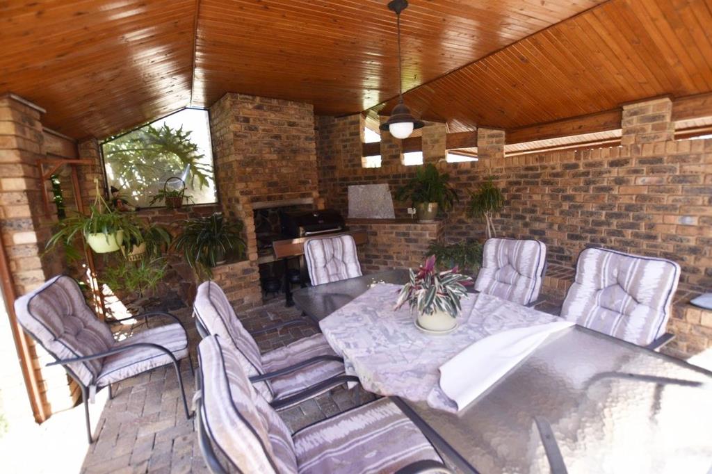 A large, established garden sets the scene for outdoor living. The covered braai area with built-in braai is perfect for year-round gatherings, all overlooking the sparkling swimming pool.