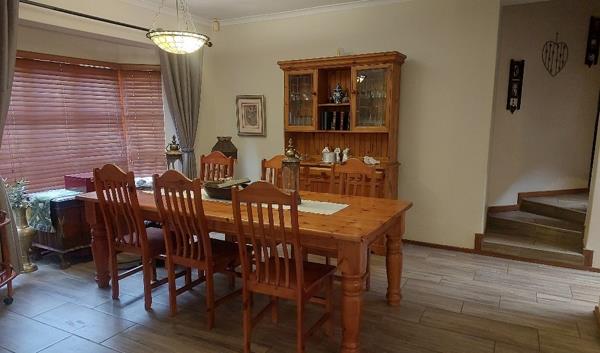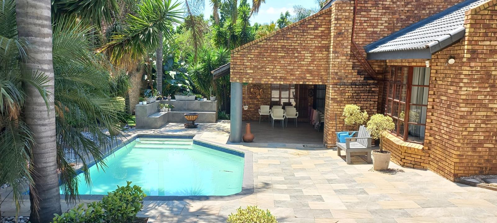 The heart of the home extends outdoors through wooden glass doors leading to a covered entertainment area with a built-in braai, overlooking a sparkling swimming pool (with heating system) and a cozy boma area perfect for memorable evenings under the stars.