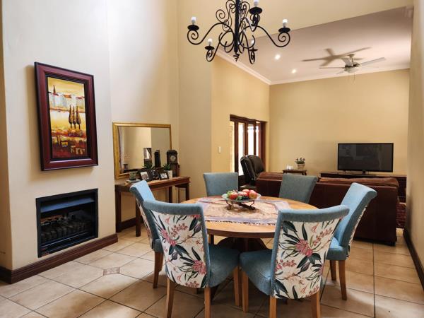 Step through the grand double-volume entrance hall into elegant open-plan living spaces that flow effortlessly. The lounge (with a fireplace) opens onto a sunny patio, while the dining room and TV room feature stack doors leading to the entertainment patio, complete with a built-in braai and views of the beautifully manicured garden. Theres even storage space under the stairs for added convenience.