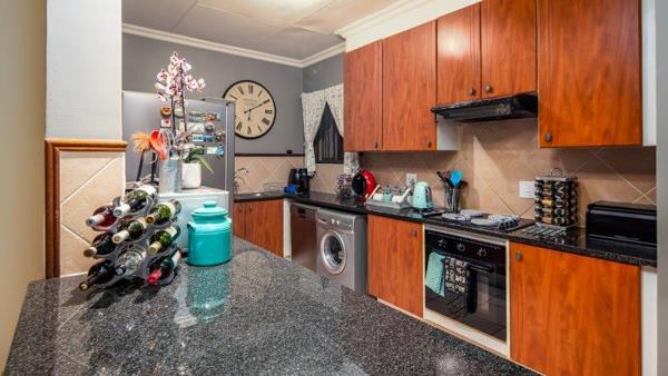 Two bathrooms (main en-suite full bathroom with shower and bath), open plan kitchen with gas hob and electric oven, lounge and dining room leading to patio with built-in braai and pet friendly garden.