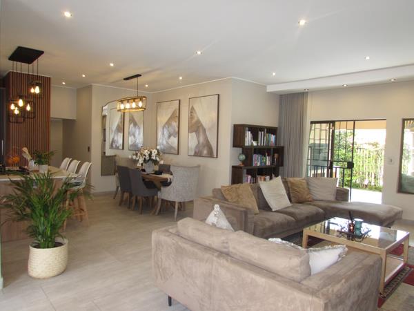 The kitchen features top-tier appliances, a central island, and clean, minimalist cabinetry, perfect for both cooking and entertaining. The kitchen flows seamlessly into a bright living area, where natural light floods the space through large windows. The lounge opens up to a veranda with a build in braai that overlooks a beautifully maintained swimming pool, creating a tranquil, resort-like atmosphere. Adjacent to the pool, an ideal setting for outdoor entertaining, complete with a designated area for a traditional braai.