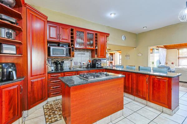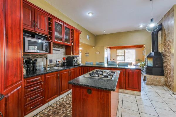 The open-plan kitchen is beautifully fitted with quality cabinetry, granite countertops, a gas hob, and a separate scullery. It flows seamlessly into the dining and lounge area, where a large fireplace creates the perfect setting for cozy family gatherings.