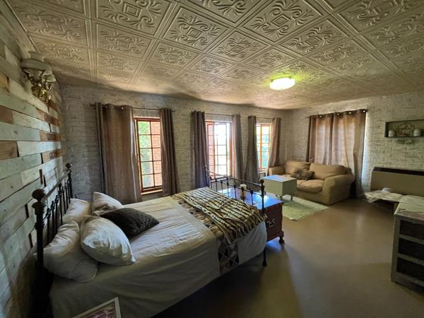 Outside is a lush bushveld feel yard with a kids play area. Covered patio looking out on the swimming pool and built-in braai with small boma. Water feature leading from the pool area down to the main entrance. Domestic room with bathroom(gas geyser)