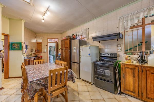 The home opens with an entrance hall and a cosy stoep area, leading to a spacious living room and TV room. The dining area flows to an older-style kitchen, which shows some wear with roof stains and dated finishes but offers great renovation potential. The living room ceiling requires attention, presenting an opportunity to modernize and add value.