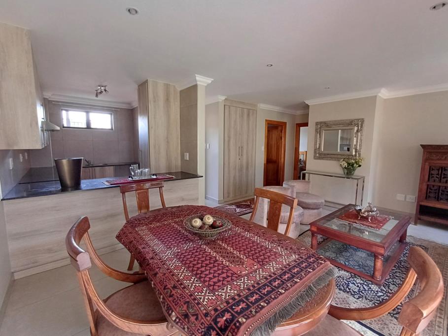 Open plan living dining area leading to a private patio overlooking manicured communal gardens