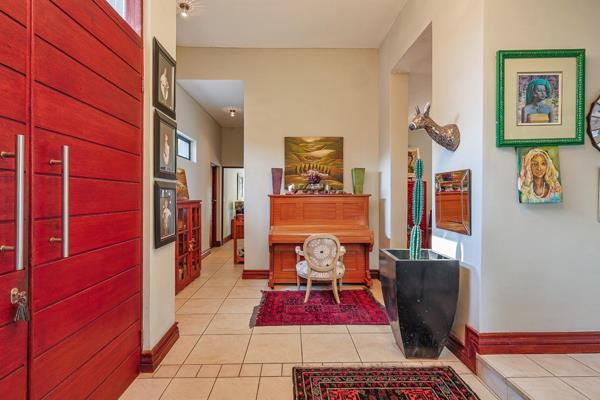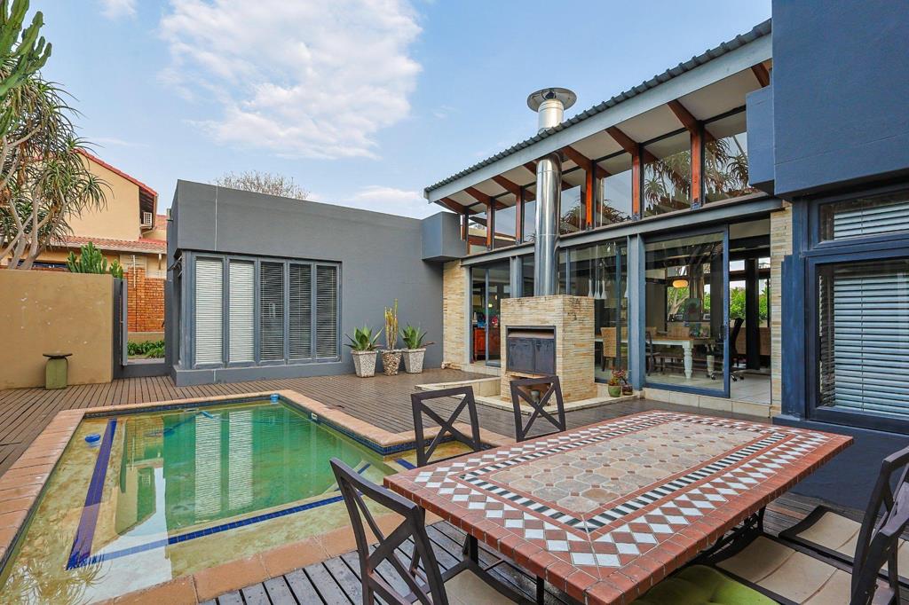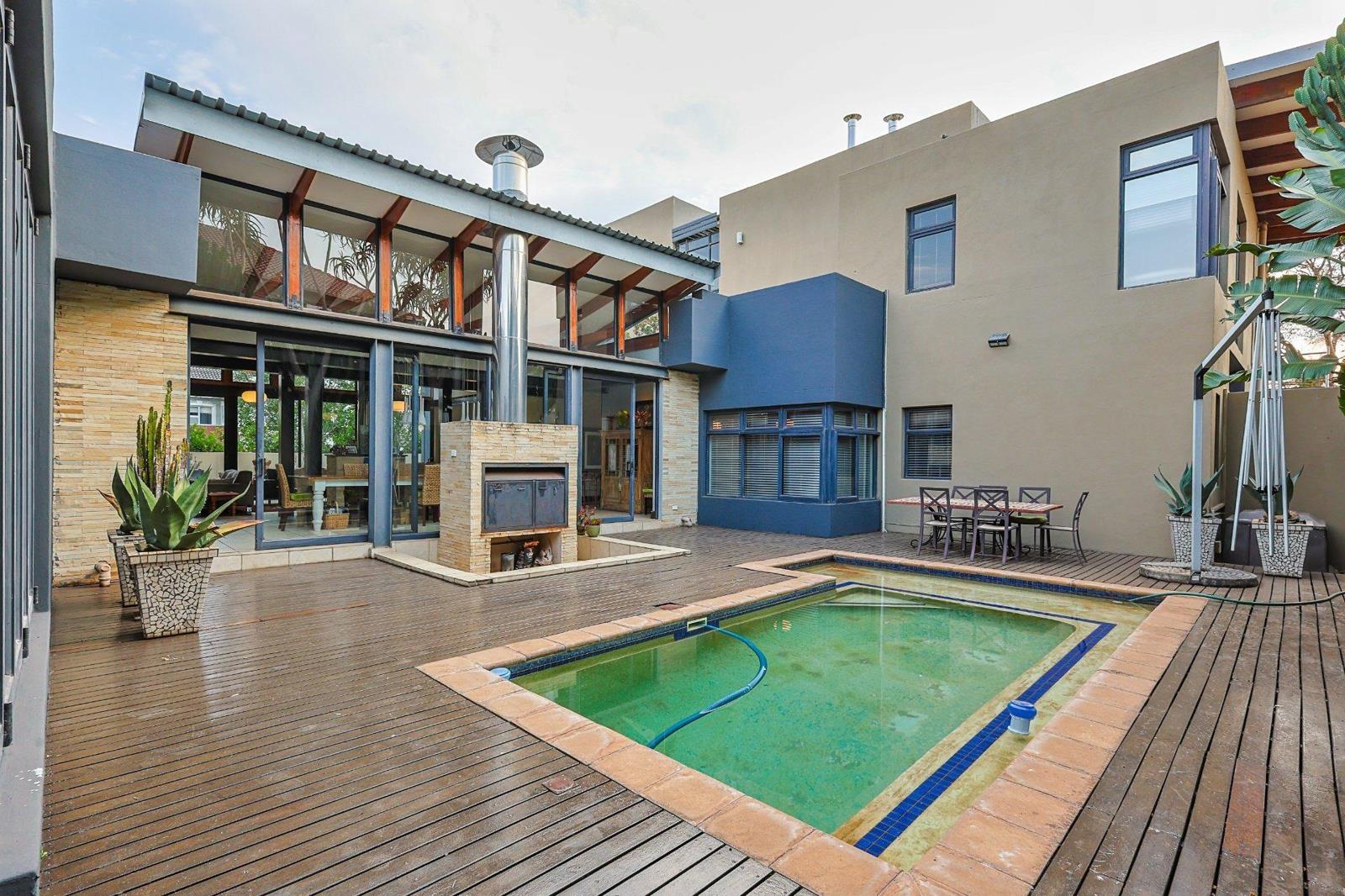 Entertainment and relaxation are at the heart of this home, with a striking free-standing central fireplace, a sparkling swimming pool with a sun deck, and a sunken outdoor braai. A large upstairs study provides the perfect work-from-home space.