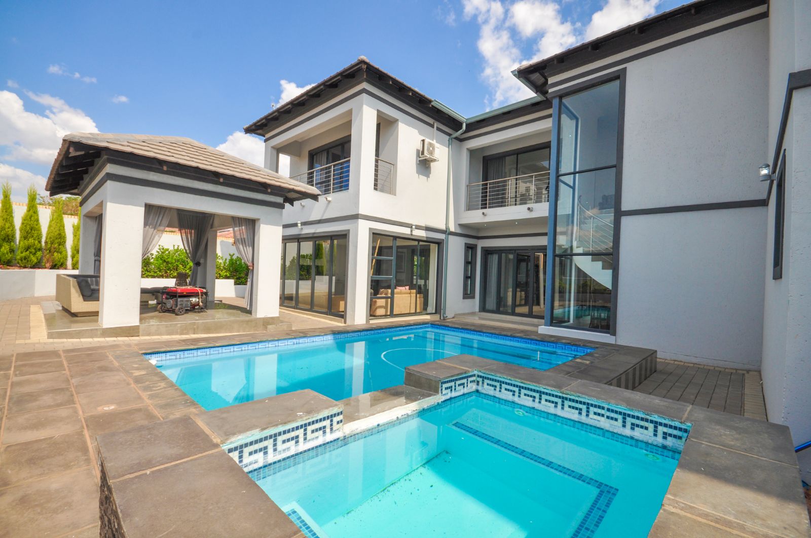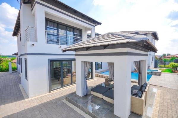 The living room, featuring a cozy gas fireplace, seamlessly flows into an enclosed braai room adorned with exquisite aluminium stacking doors. The outdoor entertainment area is a true sanctuary, complete with a shimmering pool, inviting jacuzzi, and an elegant lounging space.