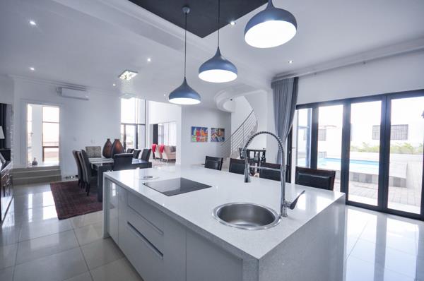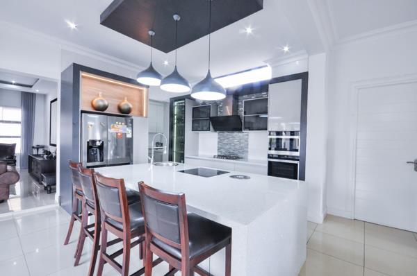 The kitchen is a chefs dream, boasting pristine white Caesar stone countertops, a gas hob, and a separate induction stovetop, along with an adjacent scullery that provides space for a dishwasher. A dedicated home office further enhances the functionality of this extraordinary dwelling.