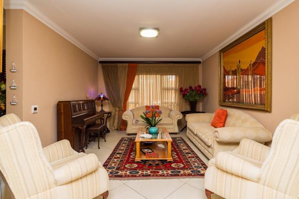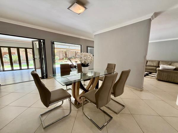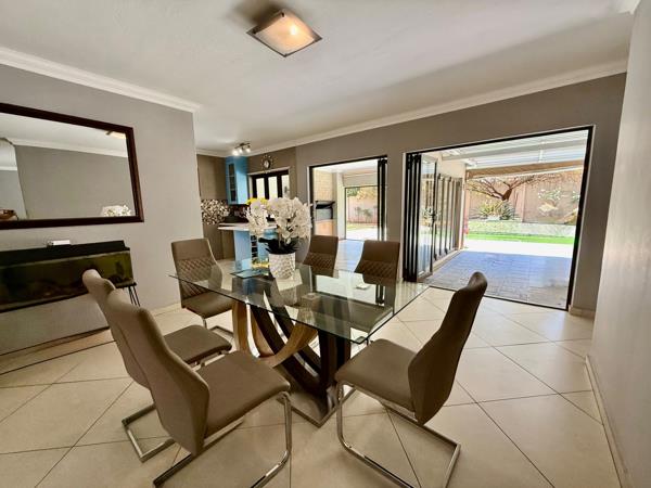 First-class 4 bedroom family home in a sought-after Lifestyle Estate!. An outstanding open plan design with remarkable space throughout. This double story house features at ground level a formal lounge, TV room, dining room and a large kitchen and scullery. The kitchen has ample cupboard space, quartz counter tops, a five-burner gas stove, two eye level electric ovens, dedicated spaces for a microwave and double-door refrigerator, under-counter spaces for four appliances, as well as a breakfast counter. Continuous with the kitchen is a spacious entertainment room with a built-in braai and glass stacking doors to the outside swimming pool deck and large garden. The stacking doors are fitted with automated roller blinds should it be required. Adjoining the entertainment room and with direct access to the dining and TV rooms is a patio covered with a roof of adjustable metal louvres. High quality canvas blinds can be lowered to enclose this area.