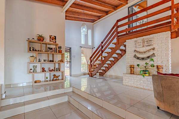 The ground floor features three comfortable bedrooms and two bathrooms, with doors opening onto a patio that overlooks a sparkling pool and built-in braai area ideal for gatherings and outdoor living. Upstairs, two additional bedrooms with en suite bathrooms are joined by a study and a generous pajama lounge, offering a private retreat for work or relaxation.