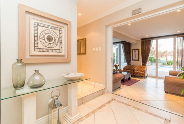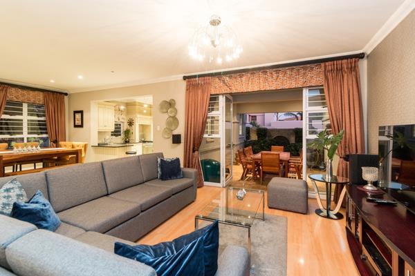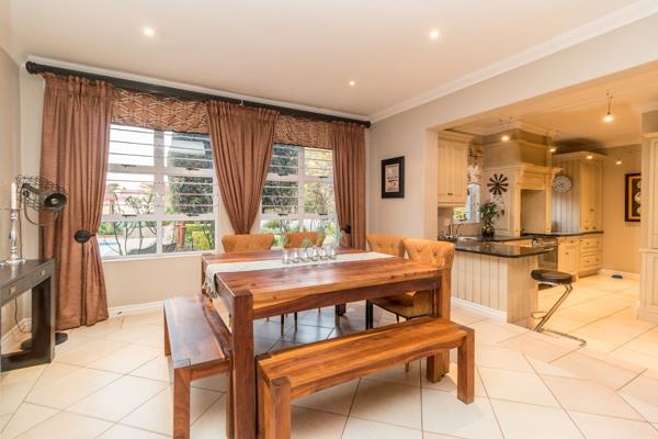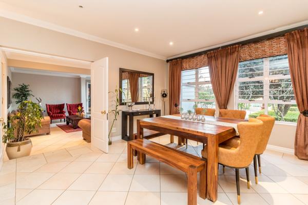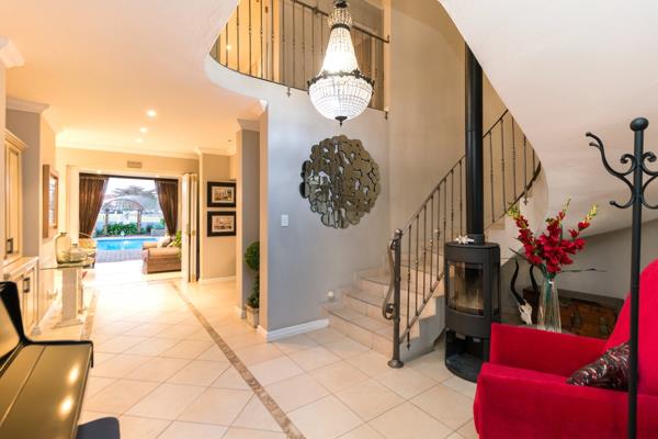 A grand entrance welcomes you to a light and inviting family home. Four living areas and a spacious entertainment area, all open onto a porch and/or the pool andamp manicured garden, to enjoy the areas to the fullest. The 65sqm entertainment area offers a large braai with rotisserie, a second gas braai, build-in sound system andamp cupboards, TV andamp DSTV connection, prep bowl and under floor heating. Open flowing family-, dining room, private porch and French kitchen with a large walk-in pantry and separate scullery.