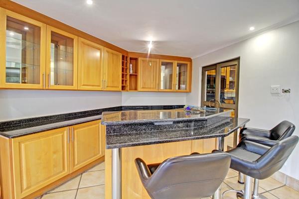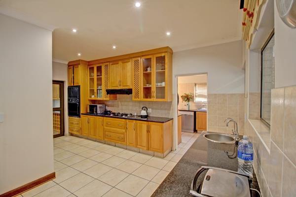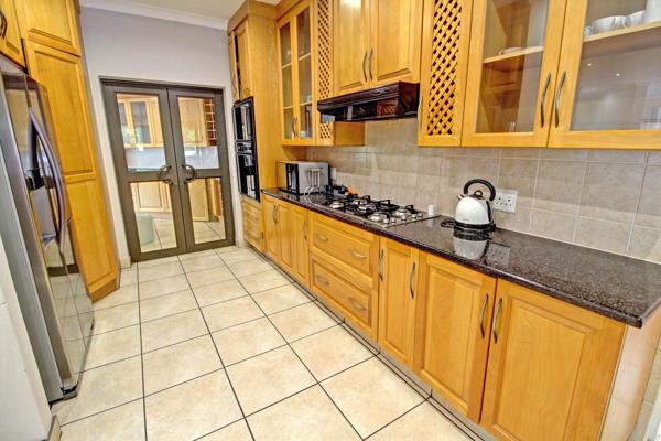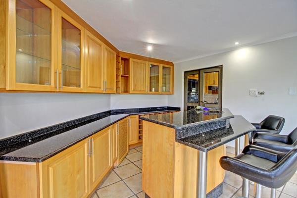 Inside, the residence offers a well-appointed layout designed for comfort and functionality. It features a dedicated lounge and dining room, ideal for entertaining, alongside a private study for work or quiet reflection. The heart of the home is a spacious kitchen, boasting extensive light wood cabinetry, dark granite countertops, a built-in gas hob, oven, and microwave. A practical scullery enhances convenience, while glass doors provide seamless flow to adjacent areas.