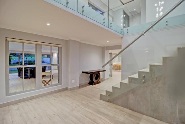Step inside to an expansive interior featuring a sophisticated open-concept design with high ceilings, creating an airy and spacious atmosphere. The home boasts four generously sized bedrooms, each complemented by its own en-suite bathroom, ensuring privacy and comfort for all residents. Two distinct lounges and two dining rooms provide versatile living and entertaining spaces, while the modern kitchen is ready to inspire culinary creativity. A striking glass-balustrade staircase and light-toned, wood-look flooring add to the contemporary aesthetic.