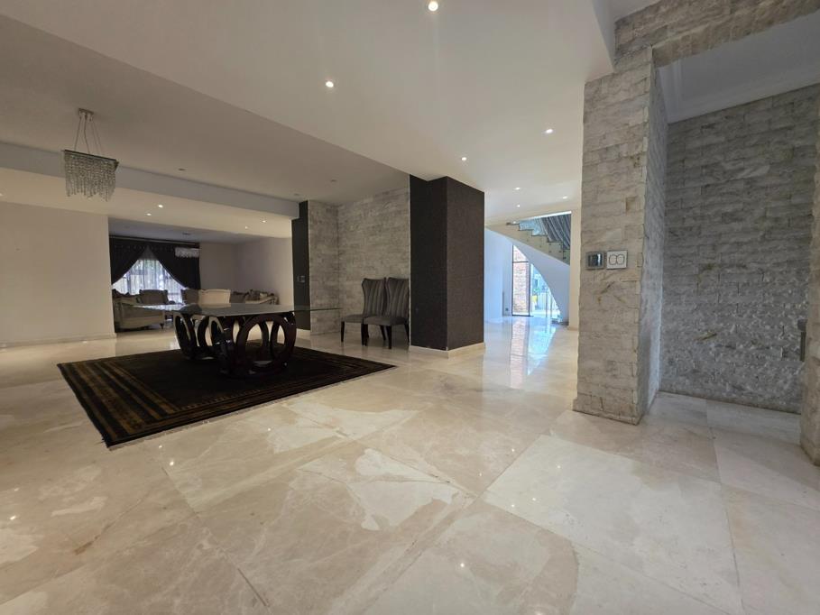 The grand entrance hall sets the tone with its dramatic double-volume ceilings, sweeping staircase, and polished marble floors that shimmer beneath a magnificent chandelier a true sense of arrival.