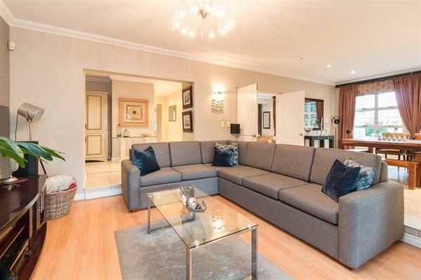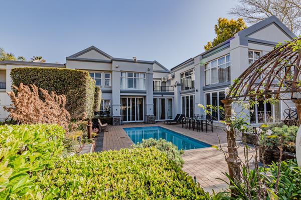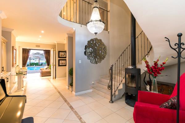 The home is grandly appointed, featuring an impressive entrance hall with a beautiful spiral staircase that leads to an unusual lead glass window feature with natural light streaming through to the upper level. The four living areas and spacious entertainment area open onto a porch and/or the swimming pool and a manicured garden. The 65 sqm entertainment area with under floor heating and huge stack doors is ideal for hosting quests, as it offers a built-in sound system, TV and DSTV connection, double braai with rotisserie, a gas braai, lots of cupboards and as prep bowl.