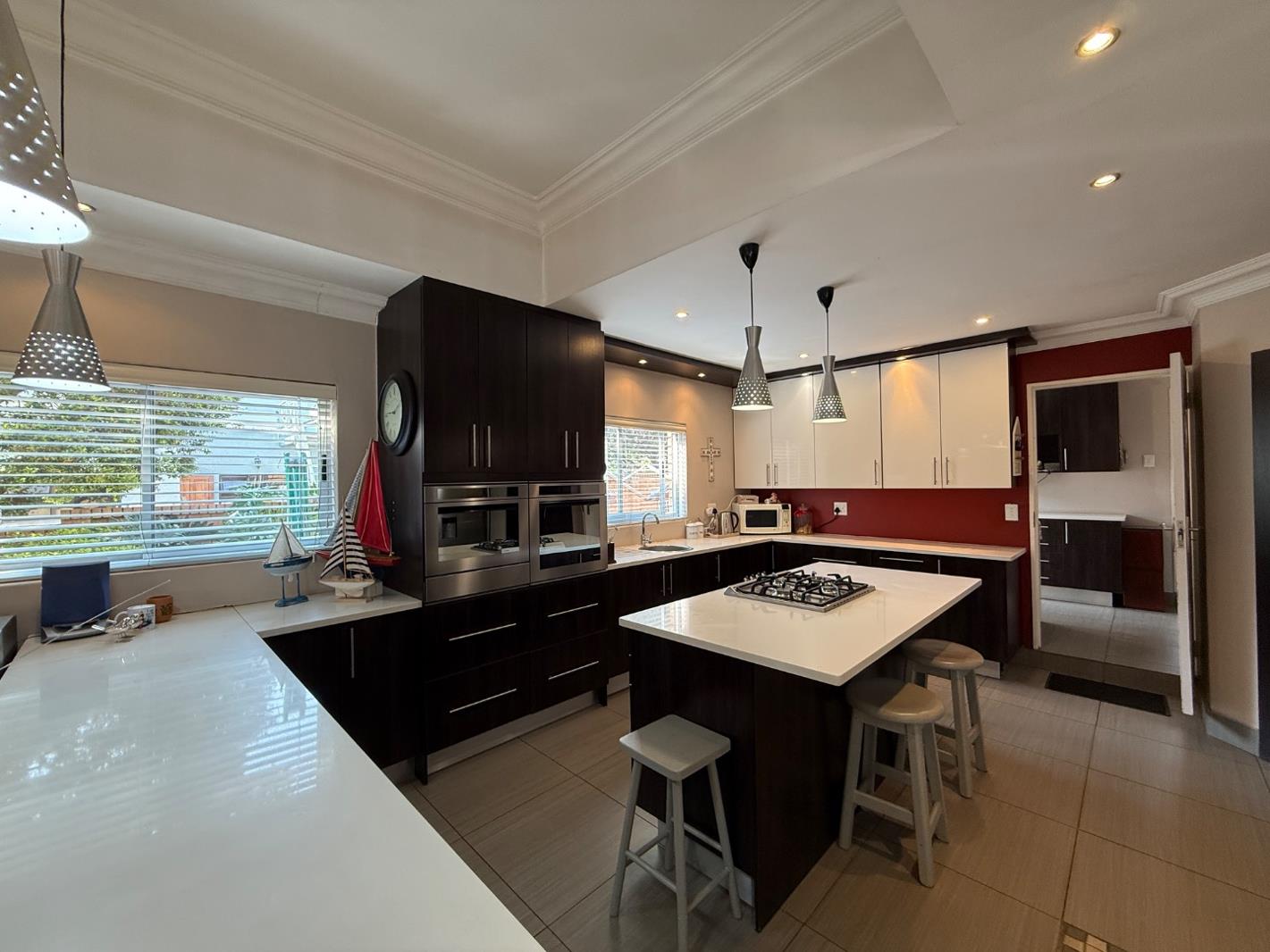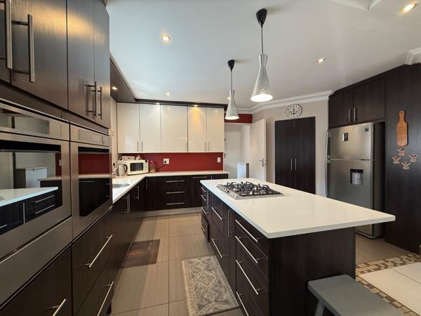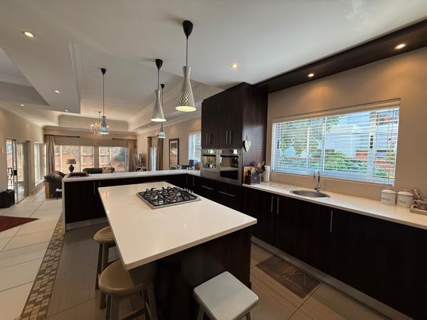 This elegant single-level home in the prestigious Woodhill Golf Estate blends luxury, comfort, and practicality with ease. Designed for low maintenance, it offers a spacious garden and a veranda overlooking the pool, creating seamless indoor-outdoor living. The expansive open-plan layout features a lounge, TV lounge, dining area, and a gourmet kitchen complete with a breakfast nook, gas stove, custom cabinetry, granite countertops, a large pantry, and a separate scullery and laundry. The main suite includes a walk-in closet and en-suite bathroom, while 2 bedrooms open with stack doors directly to the pool. Additional features include a private study, a full staff room, a combination of tile and laminated flooring, and an enclosed patio, making it ideal for year-round entertaining. Double automated garages with direct access and ample parking further enhance the convenience of this home.