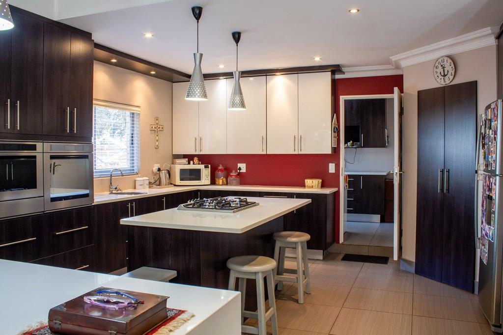 The welcoming entrance opens into a bright, open-plan layout that includes a generous lounge and dining area, and a modern well-equipped kitchen. The stylish kitchen features ample custom built cabinetry, a centre island with a gas hob, a double eye-level oven and a large walk-in pantry, ideal for everyday living and entertaining. The kitchen gives access to a spacious scullery with extra built-in cupboard space and appliance fittings.