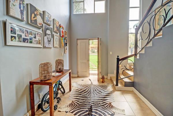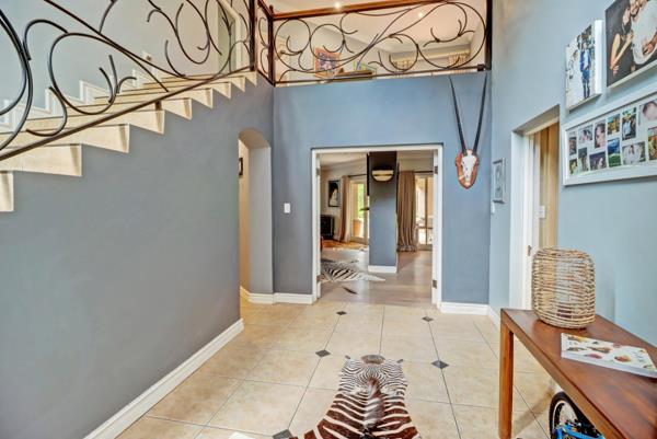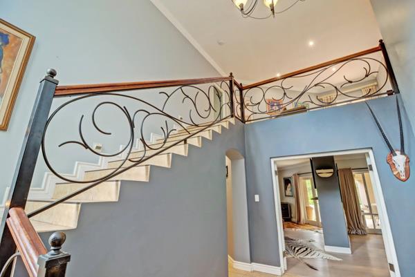 Step inside to a grand double-volume entrance hall, where a sweeping staircase with elegant wrought-iron and wooden railings serves as a magnificent focal point. The spacious foyer, adorned with clean tiled flooring and illuminated by a decorative chandelier and recessed lighting, sets a sophisticated tone. Multiple archways suggest a seamless flow into the home''s expansive living areas, which include a dedicated dining room and a comfortable lounge. These spaces provide ample room for both formal entertaining and relaxed family gatherings. Large windows throughout ensure abundant natural light, creating bright and inviting interiors, complemented by a well-appointed kitchen ready to cater to all culinary needs.